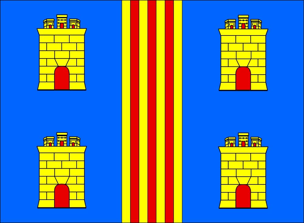 La bandera es de paño azul, de proporciones 2:3, ancho por largo; con el señal real de Aragón con sólo tres palos rojos, vertical, ocupando 1/5 del paño y cuatro castillos, de amarillo, aclarados de rojos, dos al asta y los otros dos al batiente, uno sobre otro.